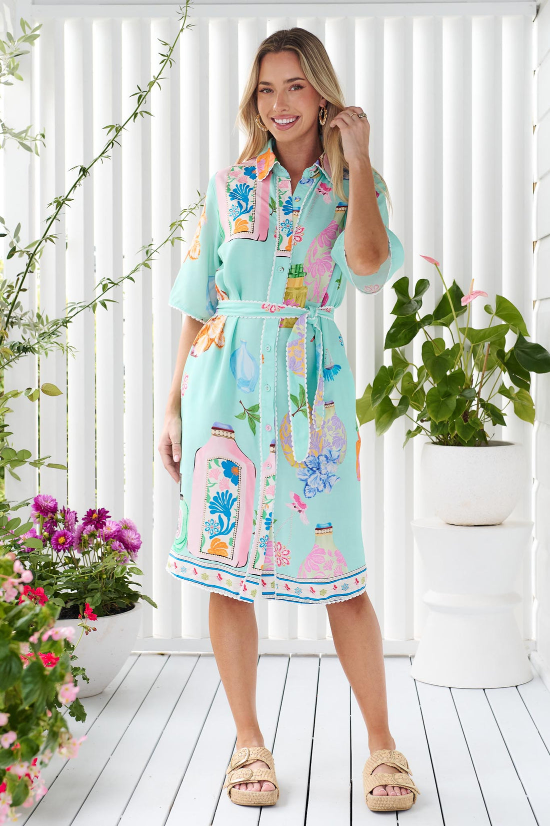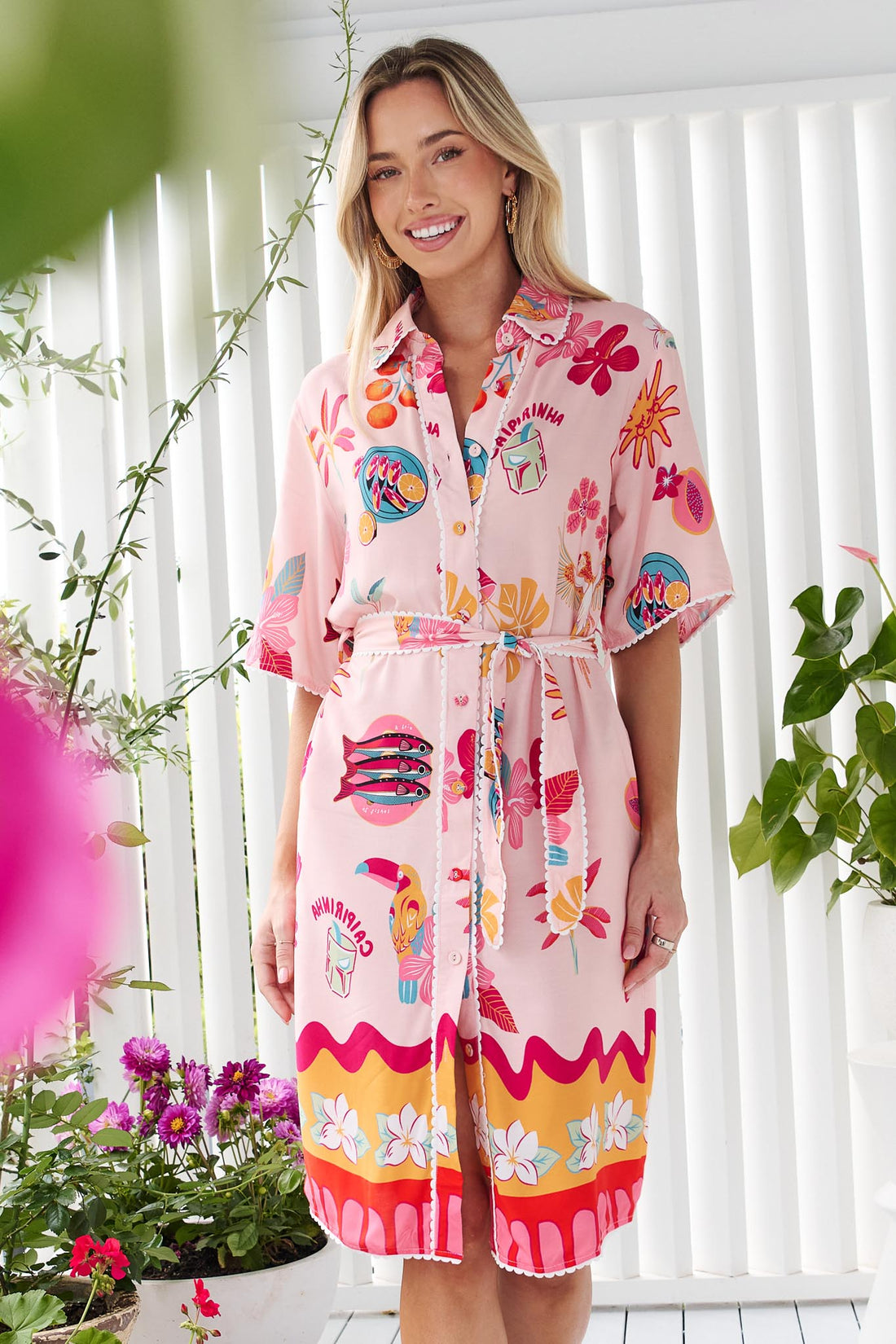 The Cove Dress is designed in a classic shirt dress silhouette and features short sleeves, contrast stripe trims and a flattering belted waist. The colourful, summer print on a vibrant watermelon hue makes this a fun addition to your warm weather wardrobe.